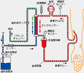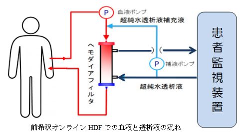 透析液の一部を直接血液回路内へ注入し、フィルター内で大量の濾過を行う血液浄化法です。